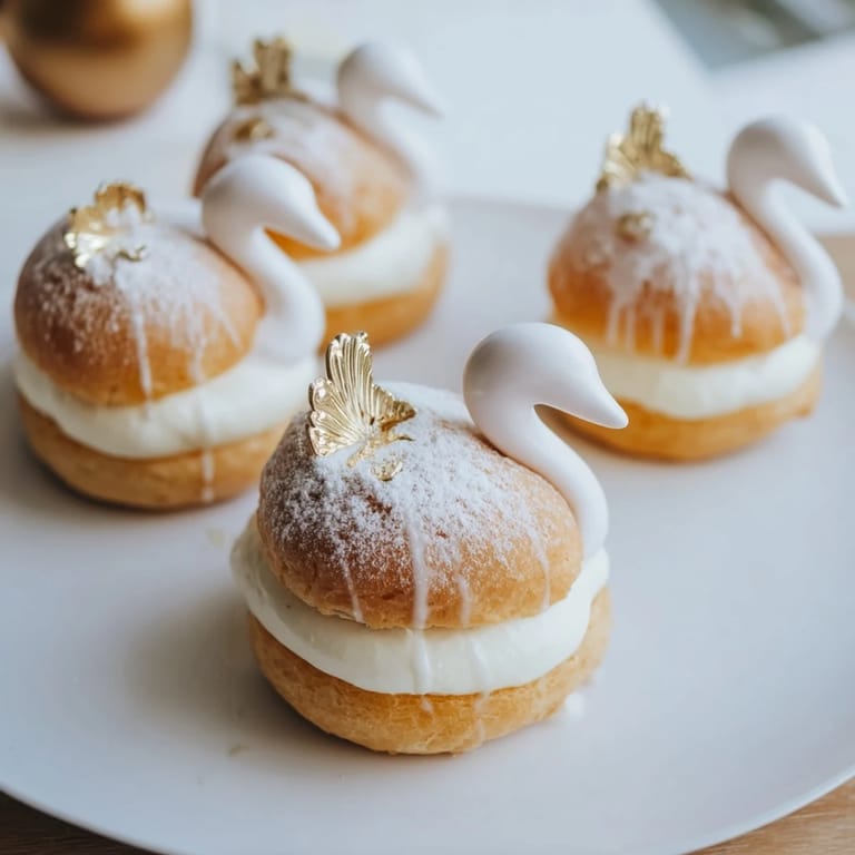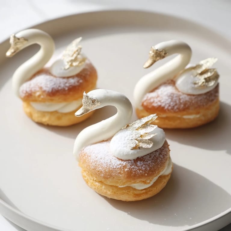Save to Pinterest An exquisite platter of delicate, swan-shaped petit fours featuring airy choux pastry filled with vanilla cream and glazed with fondant. Perfect for elegant gatherings, afternoon teas, or as a show-stopping dessert centerpiece.