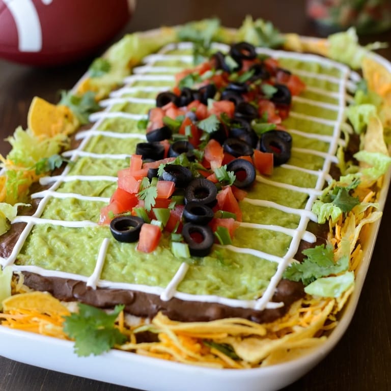 Save to Pinterest A festive and crowd-pleasing layered dip arranged to resemble a football field, perfect for game day gatherings.