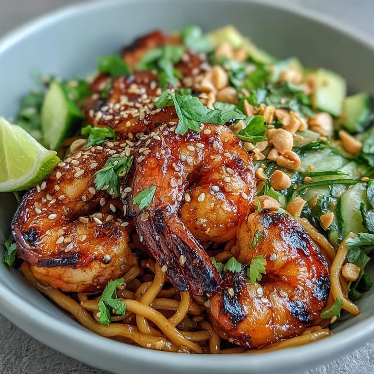 Save to Pinterest One humid summer evening, my neighbor came over with a bag of enormous shrimp from the farmers market, and I had maybe twenty minutes before dinner. I'd been craving something light but satisfying, so I pulled together what felt like a spontaneous invention—grilled shrimp, cold noodles tossed in sesame, and whatever fresh things were hiding in my fridge. That bowl became the thing everyone asked me to make again, and I realized it wasn't luck—it was that perfect marriage of smoky char, cool crunch, and nutty depth that just works.