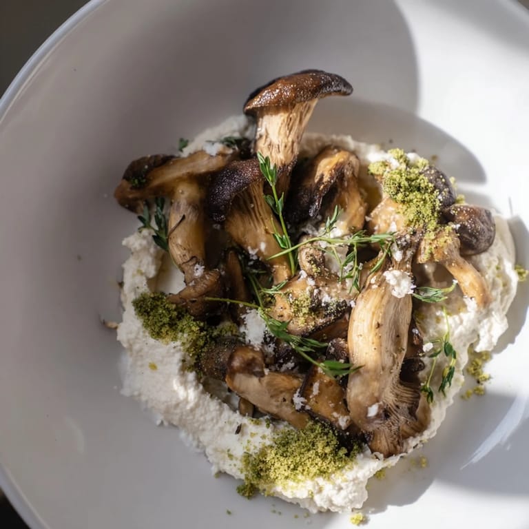 Arrange the whipped cheese as a base, top with sautéed mushrooms, scatter herb moss crumbs, and surround with fresh greens and crunchy crackers for a shared experience.