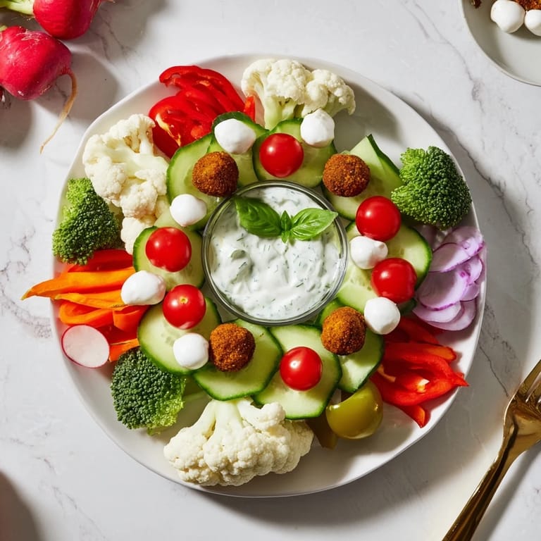 Cherry tomatoes, cucumber rounds, red bell pepper strips, radishes, cauliflower and broccoli florets, and baby carrots are included for a colorful presentation.