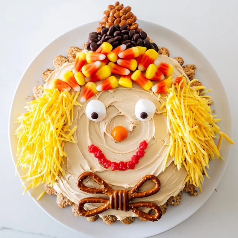 Save to Pinterest A whimsical and festive candy platter arranged to resemble a cheerful scarecrow—perfect for autumn gatherings, Halloween parties, or a fun edible centerpiece.